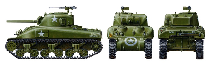 The first M4 Sherman production model was designated the M4A1, and possessed a distinctively rounded cast hull. A total of 6,281 M4A1 tanks were produced between February 1942 and December 1943. Armed with a 75mm M3 cannon and powered by a 350hp Continental air-cooled R975-C1 radial gasoline engine, the M4A1 was capable of top speeds of 38.9km/h. Early versions had the M34 gun mount with narrow shield, while the 3-piece gear housing was changed to a 1-piece design in later production runs. Applique armor was often added to the upper hull and turret in order to improve protection. The M4A1 served with many armies on various fronts, including with the British 8th Army in North Africa, where it contributed to the victory at El Alamein.
