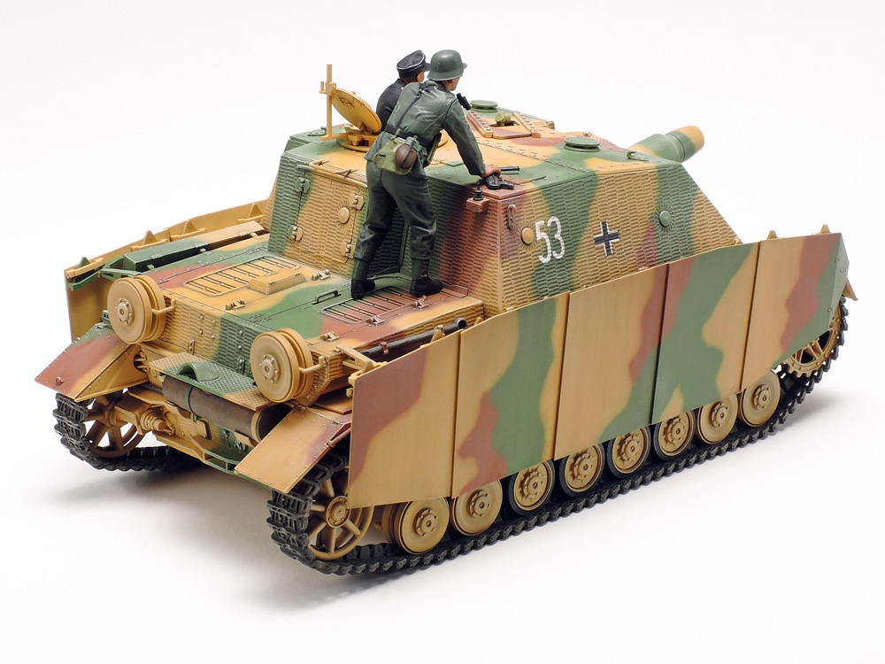 ★This is a 1/35 scale plastic model assembly kit. Length: 168mm, width: 94mm. ★The kit gives a highly accurate recreation of the Brummbär with its stubby 15cm gun. ★Gun barrel offers elevation and depression. Traverse motion is in tandem with sight and cover. ★Five Schürzen plates are attached and can be removed individually, for a variety of looks. ★Parts are included to recreate rubber-rimmed and all-steel road wheels, used in different combinations depending upon chose marking option. ★Comes with a commander torso figure for the cupola, and a full-body crew figure. ★Decals for two marking options are included.