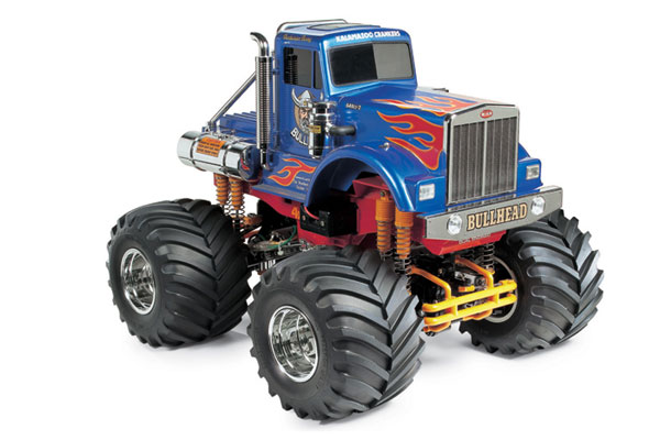 The Bull Head monster truck features a body that was inspired by tractor trucks. The front grille, air cleaners, exhaust pipes, roll bar, and fuel tanks are recreated with metal-plated parts. The chassis features a twin-motor/dual gearbox 4WD drivetrain, 8 coil spring dampers, massive 165mm diameter tires, as well as a 4-wheel steering system to help the model navigate tight corners.