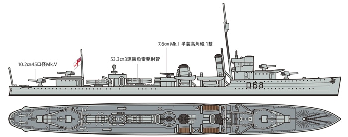 ●Standard Displacement:1,090 tons ●Length: 95.1m ●Width: 9m ●Speed: 34 knots ●Horsepower: 27,000 ●Armament: 10.2cm Mk.V guns x4, 7.6cm Mk.L gun x1, 53.3cm torpedo tubes (triple mount) x6