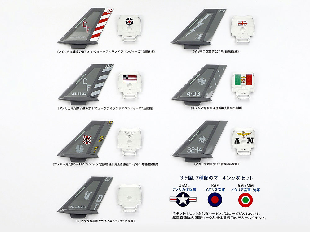 - Comes with decals to depict 7 marking options from a total of three countries (United States Marine Corps, Royal Air Force, Italian Air Force / Navy).