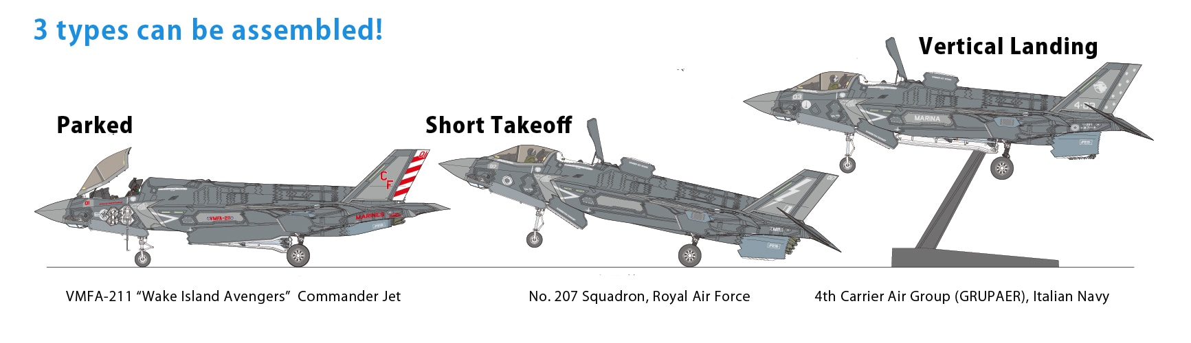 - The model can be put together in one of the following three ways; Parked, Short takeoff, and
