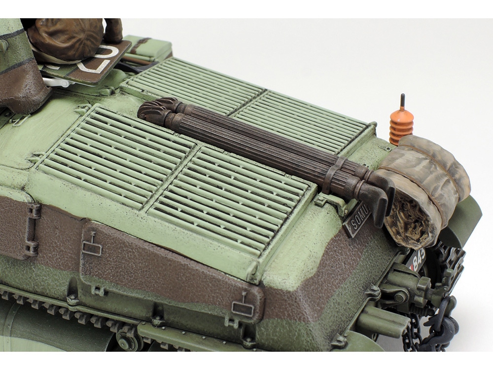 This is a 1/35 scale plastic model kit of the SOMUA S35. Length:153mm, Width: 63mm. ★Extensive measurement of a real SOMUA S35 led to this highly accurate recreation of the rounded cast metal hull and turret. ★Features realistic depictions of cast metal surfaces. ★Intuitive parts layout efficiently captures the bogey suspension and side armor plates with aplomb. ★Link-type assembly tracks provide excellent realism. ★Comes with a commander figure to be positioned in the turret, plus 3 marking options and color camouflage pattern reference illustrations.