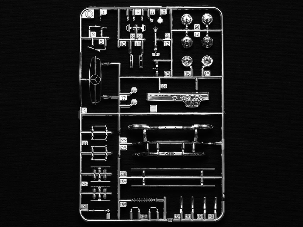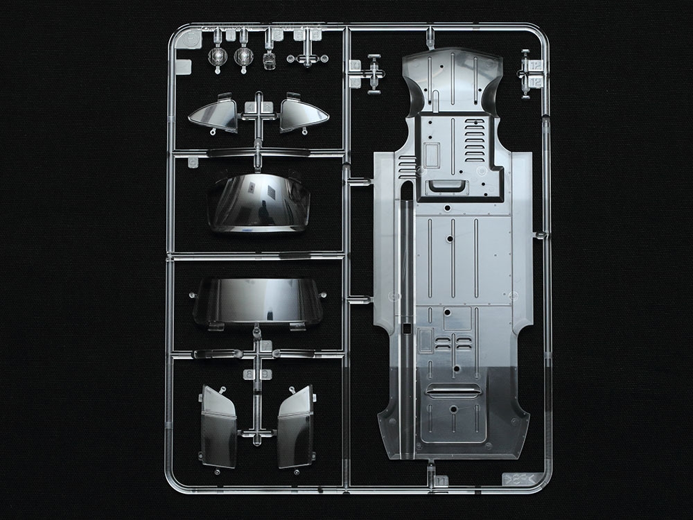 This model kit is based on Item 24338 Mercedes-Benz 300SL, with the “Full-View” treatment. The “Full-View” series features clear body parts which display the model’s interior and allow car fans to enjoy its beauty. The 300 SL was released in 1954, the production sports car version of a phenomenally successful racing prototype from 1952. It featured an elegant body with gull wing doors, plus a lightweight multi-tubular space frame. A 3-liter inline-6 engine pioneered direct fuel injection. Its combination of looks and pioneering power makes it a favorite even in modern times.