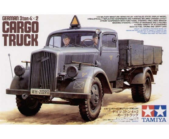 This is a 1/35 plastic assembly model of German 3ton 4×2 Cargo Truck. ★Length:174mm Sturdy body and unique cabin are all realistically reproduced. ★Accurately recreated forward-bent chassis, and suspension features fewer parts for easy assembly. ★Movable front wheels for perfect diorama situations. ★The rear cargo area has a realistic wood pattern for greater realism. ★Masking stickers for windows are included in kit. ★1 driver and 1 navigator figure and four different markings included. ★Comes with sets of fuel drums and jerry cans.