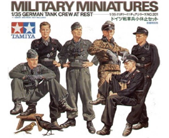 This is a 1/35 scale plastic assembly kit of a WWII German tank crew reproduced in realistic relaxed poses. Set includes figures to depict two tank commanders, three tank crew, and an enlisted soldier, in 3 different types of uniform. This set is perfect to display in combination with a wide range of German tank models.