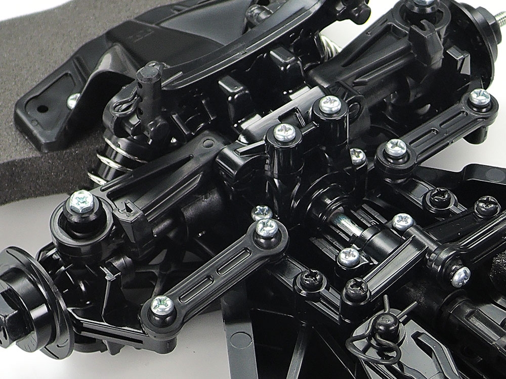 - The model utilizes the shaft-driven 4WD TT-02 chassis which features superior adaptability and stability.