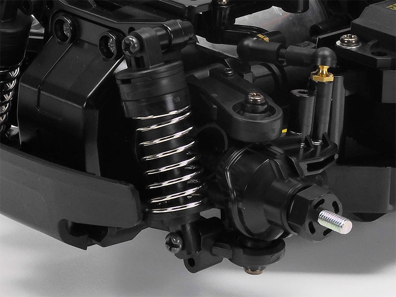 The 4-wheel double wishbone suspension features a symmetrical structure with friction dampers, and unitized sections such as the motor mount, final gears, and suspension ensure ease of assembly and maintenance.