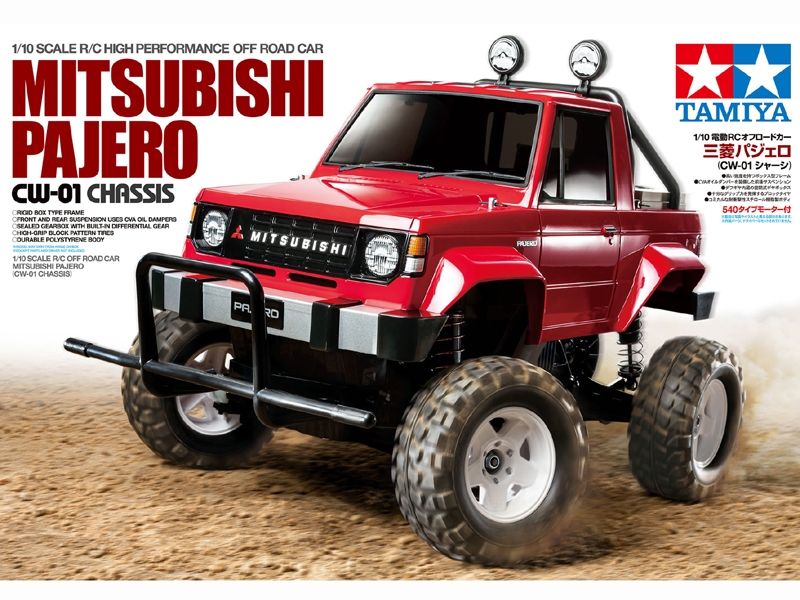 This Tamiya Mitsubishi Pajero (CW-01) 1/10 scale R/C assembly kit recreates the Mitsubishi Pajero on the CW-01 chassis. After the announcement of its concept car at the Tokyo Motor Show in 1973, the Mitsubishi Pajero was one of the most recognizable Mitsubishi 4WD cars, sold from 1982 to 2021 through a fourth model change. At the 1983 Paris-Dakar Rally, this car took a championship in an unmodified production vehicle division, and after that, showed off its great performance around the world. This kit recreates the first-generation model which was produced from 1982 to 1990. Based upon Item 58499 1/10 R/C Mitsubishi Montero Wheelie, tires are changed from massive 115mm big ones to rock block ones, and the kit features the CVA II short oil dampers.