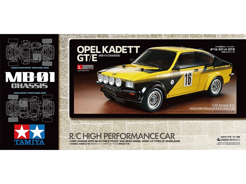 This 1/10 scale R/C assembly kit recreates the Opel Kadett GT/E on the versatile MB-01 chassis platform. The MB-01 chassis for this subject is configured in the long wheelbase and midship rear motor / rear wheel drive (MR) to faithfully capture the layout of the actual vehicle.