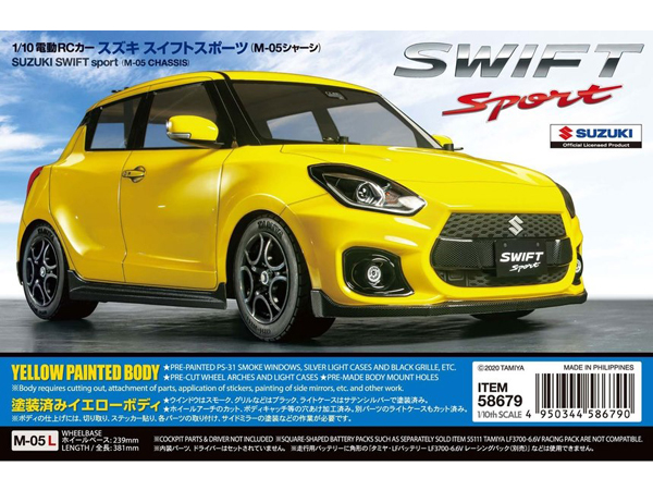 The Tamiya Suzuki Swift M05 chassis is a fun, simple on-road chassis that takes front wheel drive mechanics and puts replica compact cars on top for fun driving thrills. This kit recreates the Suzuki Swift sport. The Swift underwent a full model change in 2017, and impressively managed to improve overall design rigidity while getting lighter. It was given a wider tread, a direct injection 1.4-liter inline-4 engine and 6-speed automatic transmission. Tamiya M05 Suzuki Swift assembly kit faithfully captures the body and its details in tough polycarbonate material with the body already pre-painted!