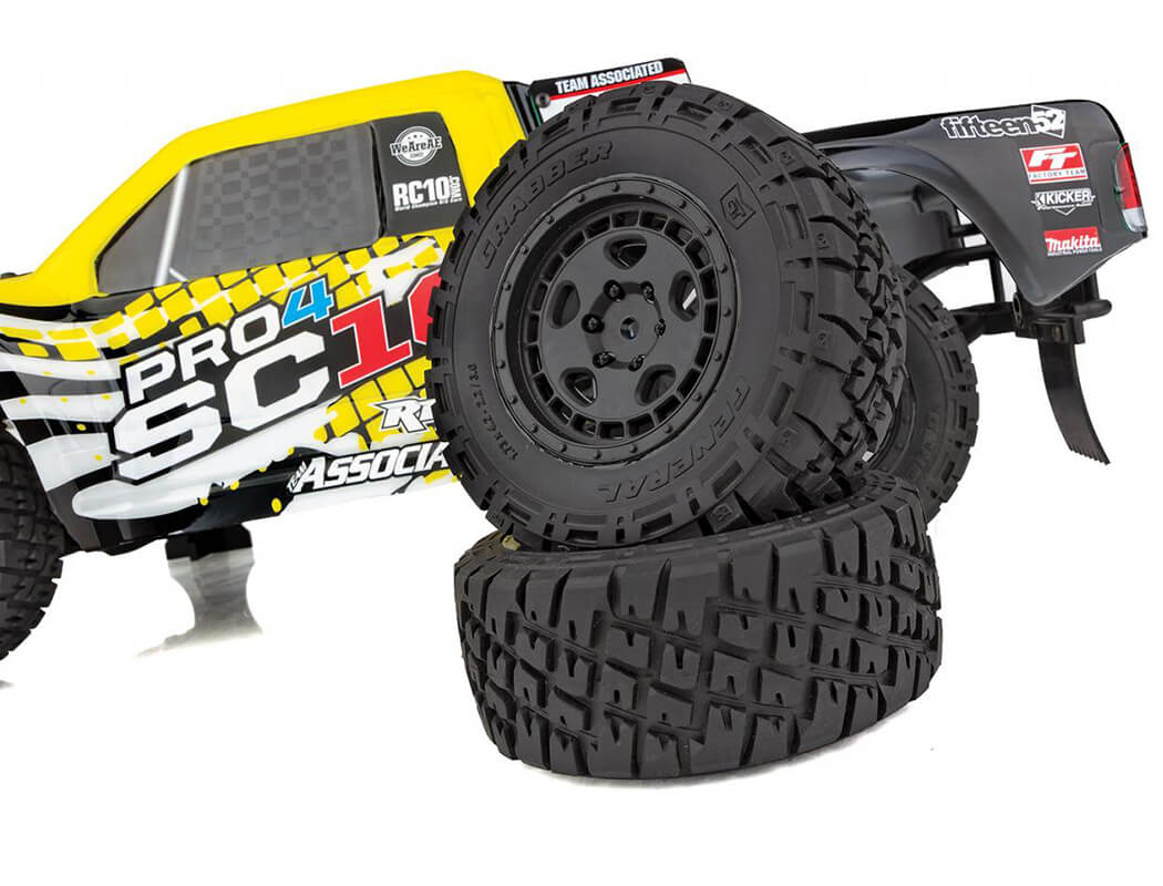 Team Associated’s Pro4 SC10 is a Ready-To-Run RC electric short course truck. The Pro4 SC10 is both all show and all go! Features include the mighty Sport 550 Reedy Power motor, 3300mAh 2S WolfPack LiPo battery, a water-resistant enclosed receiver box, adjustable oil-filled coil-over shock absorbers, and four-wheel independent suspension. The gearbox includes heavy duty three sealed gear differentials. The short course proudly rolls and jumps on Fifteen52 Turbomac HD wheels wrapped in realistic off road General Tire GTR GrabberTM all-terrain tires.