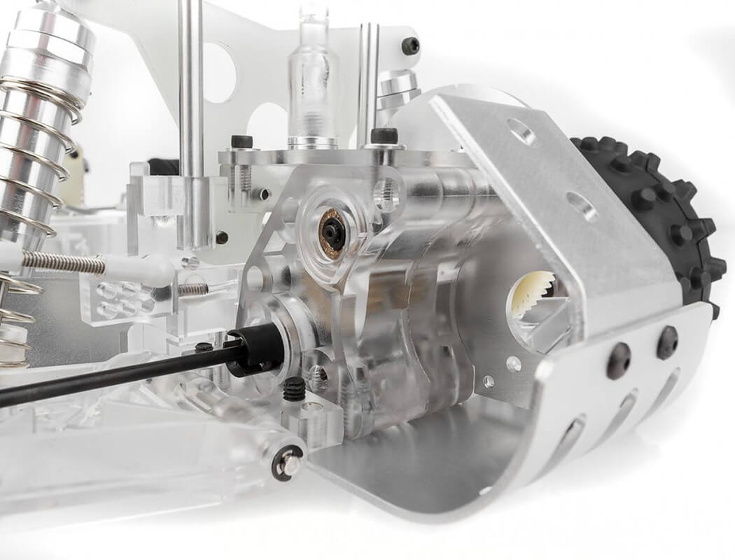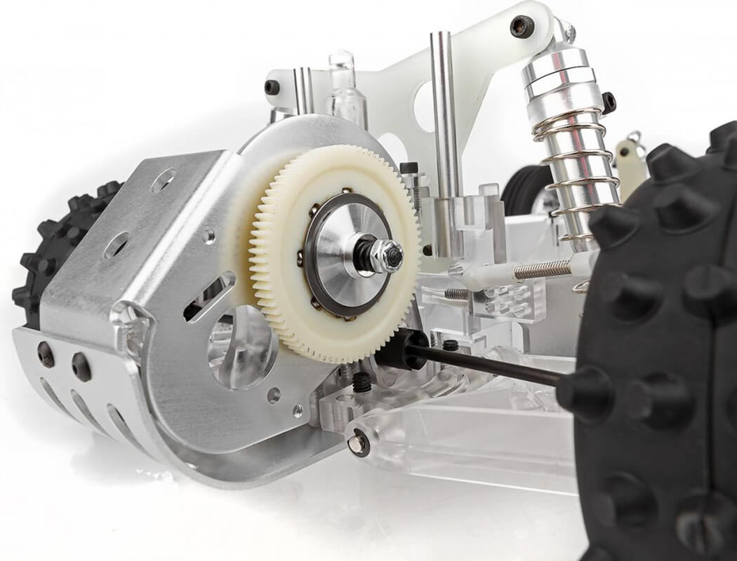 Full race rear suspension includes durable dogbone and stub axle drivetrain with pinned modular wheels. Quick-release knockoff design provides fast, accurate alignment. Low-profile gearbox uses VariLok adjustable diff and is protected by an integrated motor/heatsink.