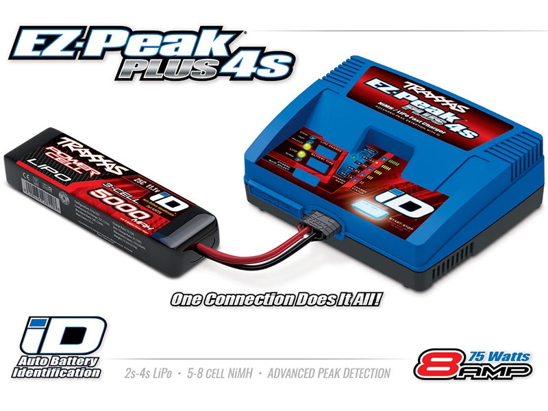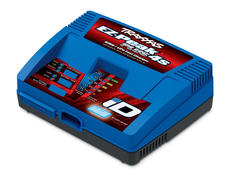 Power and Convenience The faster your batteries charge, the sooner you’re back out having fun. No one understands this better than Traxxas which is why we outfitted the EZ-Peak Plus 4s with 8 full amps (75 watts) of charging power. The charger automatically detects the type of iD-equipped battery you are using and then configures the settings for the fastest charge possible. NiMH batteries charge faster than ever with 4 amps of charging power. LiPo batteries charge even faster with up to 8 full amps. A large 40 mm cooling fan keeps the temperatures down inside the charger for powerful charging sessions. A balance port is built into the charger for older-style LiPo batteries with external balance leads. The EZ-Peak Plus 4s combines EZ-Peak power with the safety of Traxxas’ exclusive iD technology in one convenient and easy-to-use package.