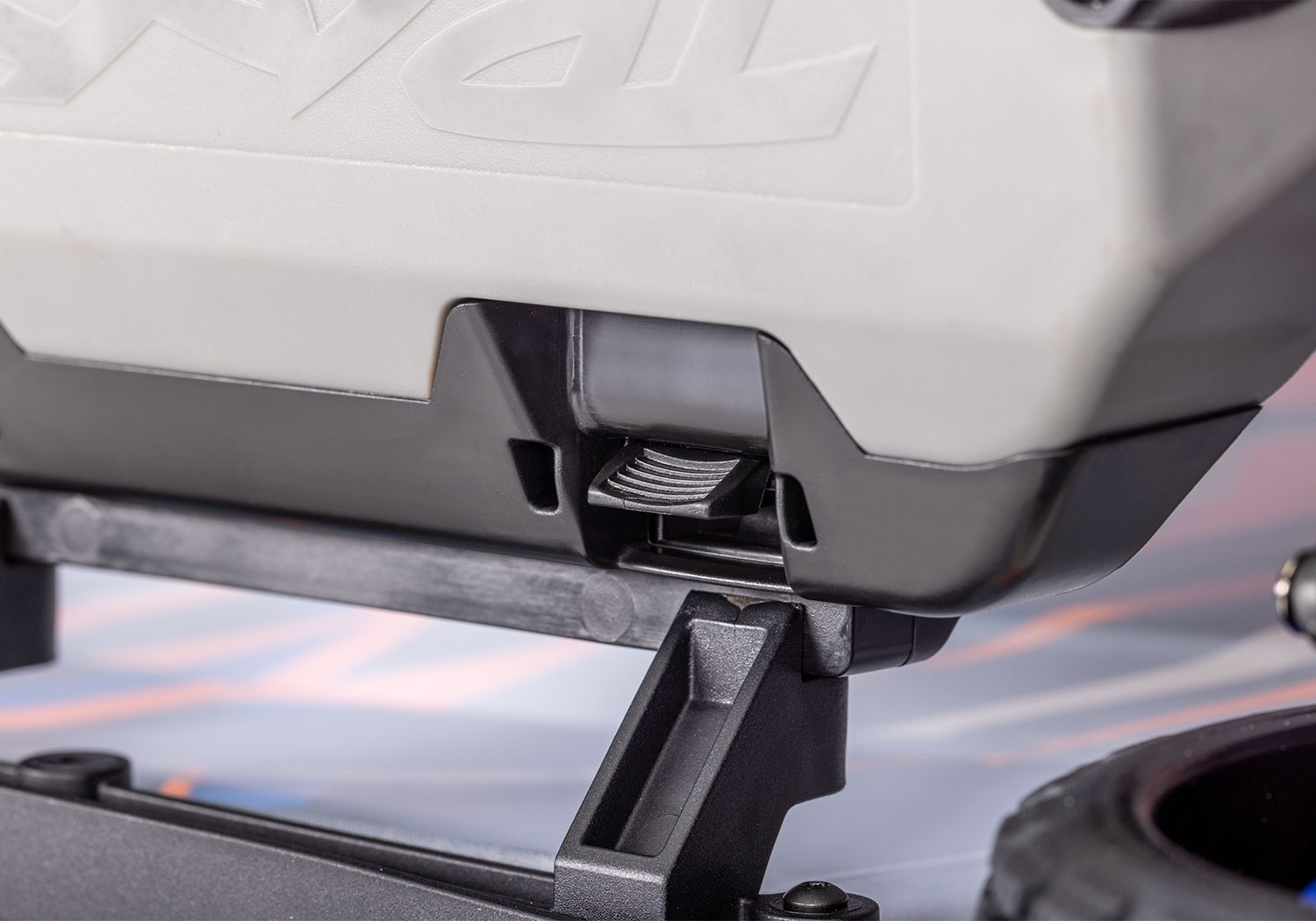 Rally’s innovative clipless body features secure mounting with quick and easy removal. No posts, no clips—just drop the body onto the chassis and snap it into place for a secure hold. When it’s time to change the battery, release the side tabs and lift up to access the chassis in just seconds.