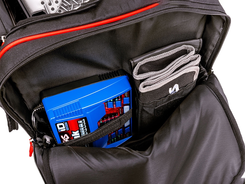 The large main compartment offers ample space for most 1/8 and 1/10 scale Traxxas vehicles with dual side pockets to stow extra gear. Large end compartments feature adjustable straps to secure a transmitter and charger safely in place. Additional hooded pockets organize batteries, tools, and other gear in separate compartments for easy access.