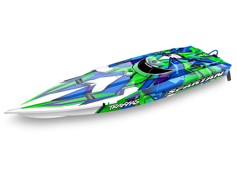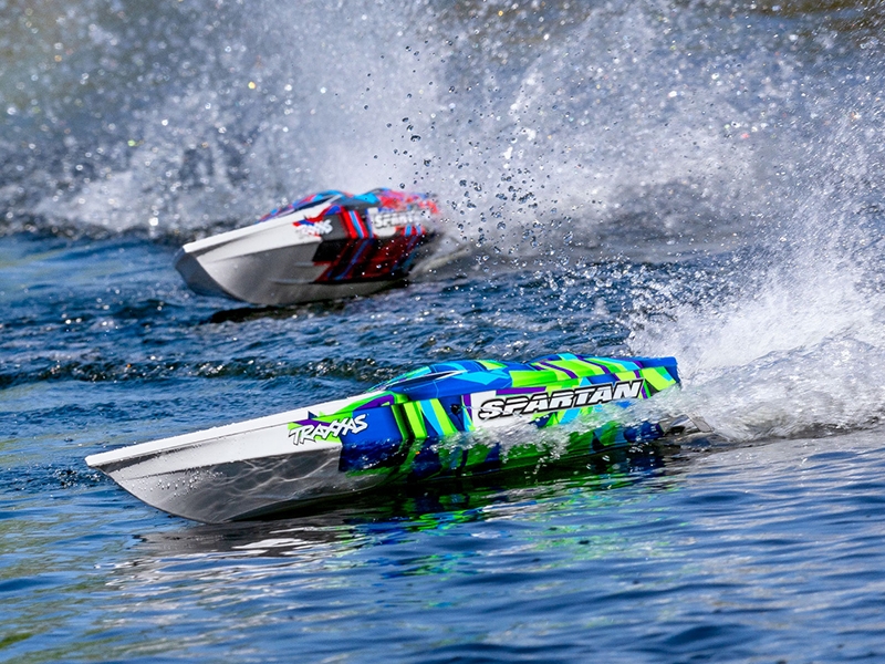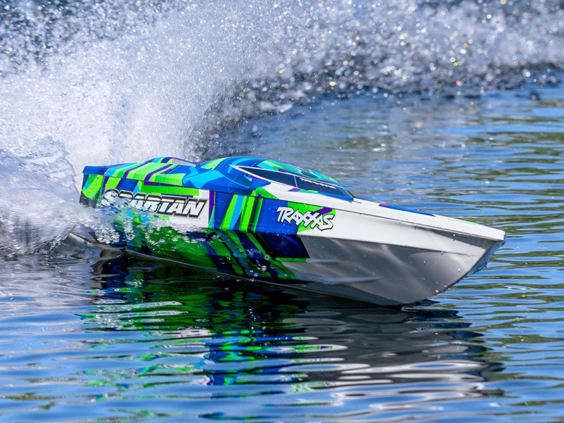Spartan is the kind of boat you expect from Traxxas. Its 50+mph fury makes even the most insatiable, power-hungry enthusiasts jump up and take notice. Spartan means business with its super-rigid, 36-inch deep-V hull, smooth, cable-drive efficiency, innovative water cooling system, and precision aluminum and stainless steel drive controls. The clean, modern hull design is built up in layers for maximum rigidity and its bold new paint makes a statement on the water. The integrated battery trays secure a wide variety of battery packs from 8.4V NiMH batteries all the way up to 8400mAh 3s LiPo packs. A high-output TQi 2.4GHz radio with the innovative Traxxas Stability Management (TSM) system keeps Spartan under complete control as it slices through the water. Spartan delivers the power, speed, convenience, and fun for which Traxxas’ award-winning cars and trucks are known. Prepare yourself for the ultimate RC boating power trip, only from Traxxas.
