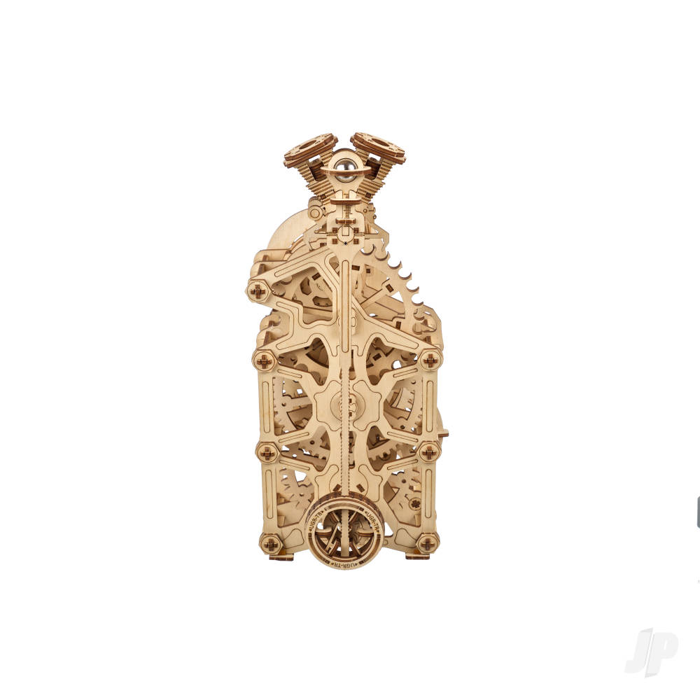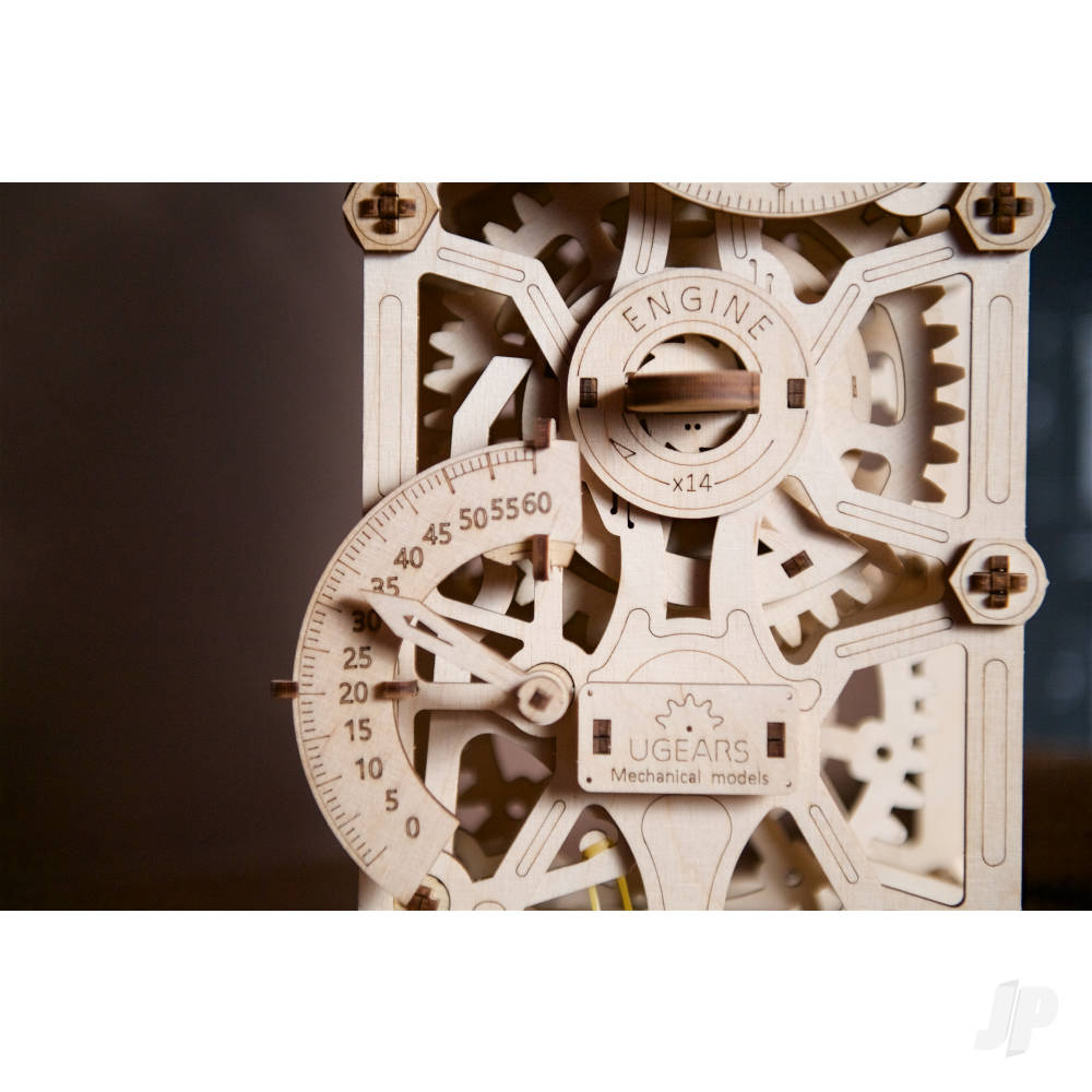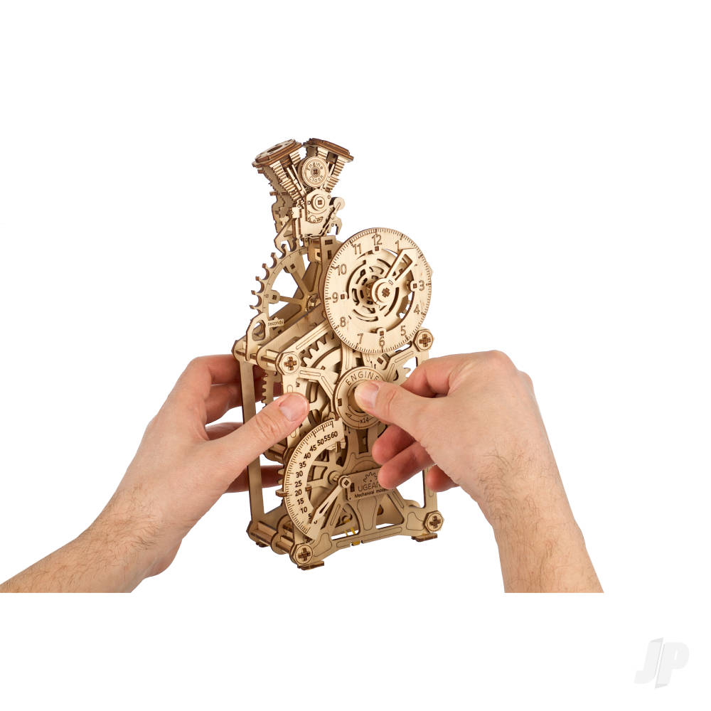 The DIY wooden Engine Clock is the latest addition to the UGears collection of working clocks, including the Aero Clock wall clock with pendulum, and the Sky Watcher Tourbillon Table Clock. While those models are both “Advanced” level, with the Engine Clock we strove to design a functional clock at the “Medium” difficulty level, so that more hobbyists could experience the satisfaction of building their own functional DIY 3D model clock. As with all UGears models, the Engine Clock is assembled without glue or special tools—just remove the laser pre-cut pieces from their art-quality composite wood boards and snap them together. Each kit comes with detailed, step-by-step, full-colour illustrated instructions in 11 languages (Ukrainian, English, German, French, Polish, Spanish, Portuguese, Turkish, Italian, Chinese and Korean) to guide your assembly, and sandpaper and wax to smooth and lubricate all moving parts for optimal function. If you get stuck during the assembly, need help troubleshooting, or break a piece during construction, just email our outstanding customer service team—we’ll be glad to answer any questions or send replacement parts free of charge.
