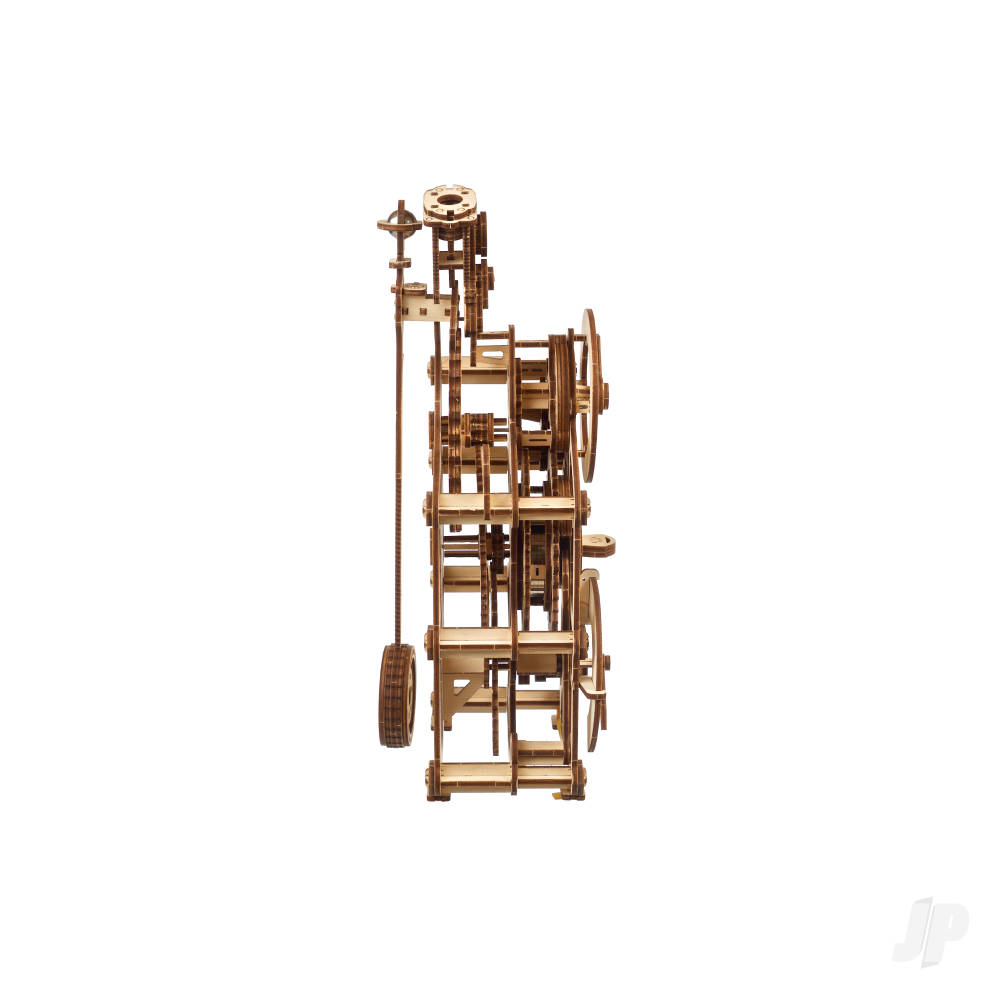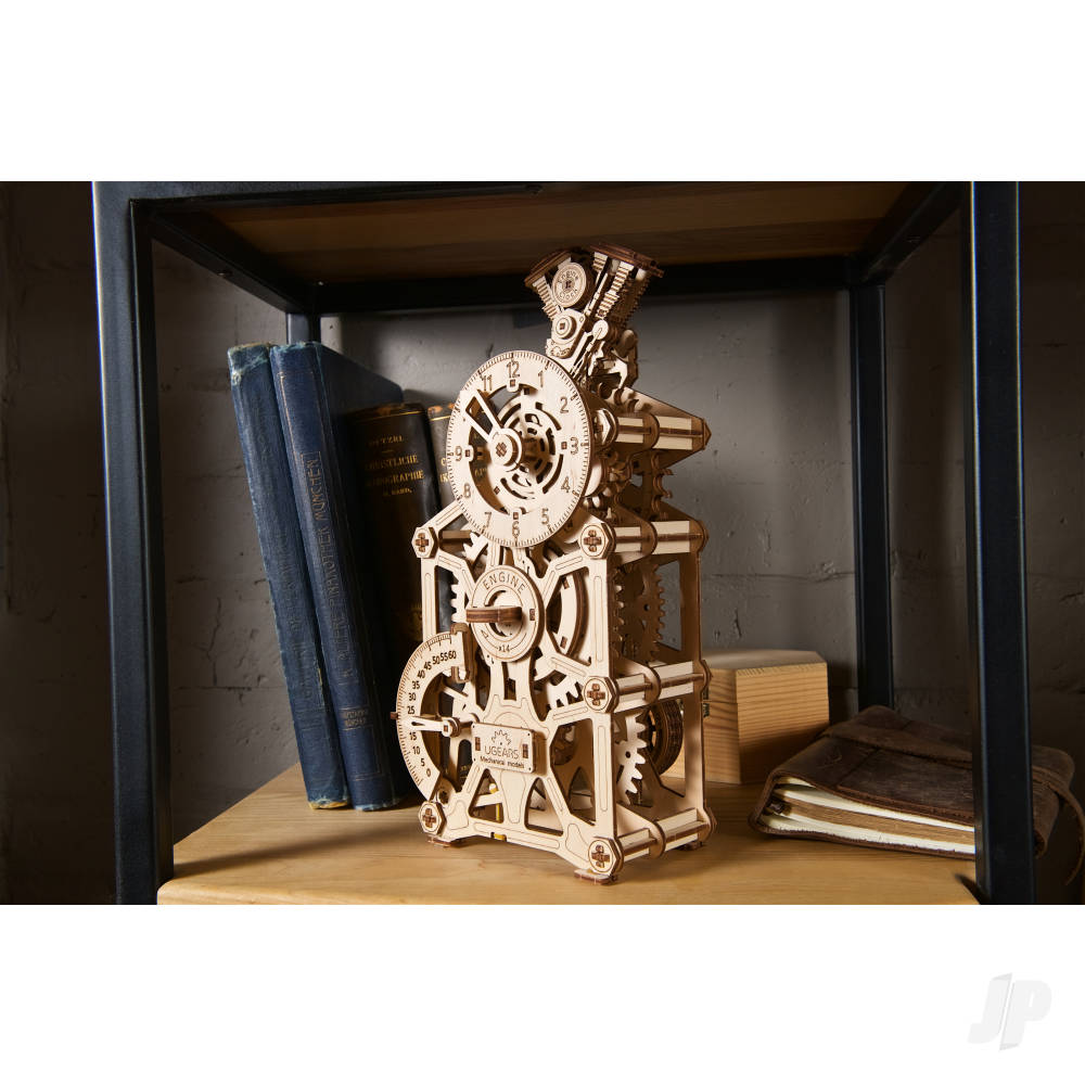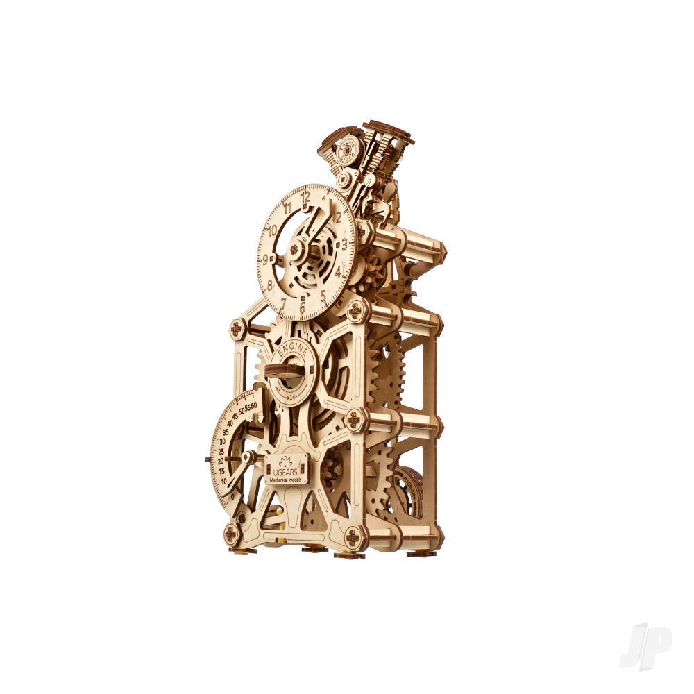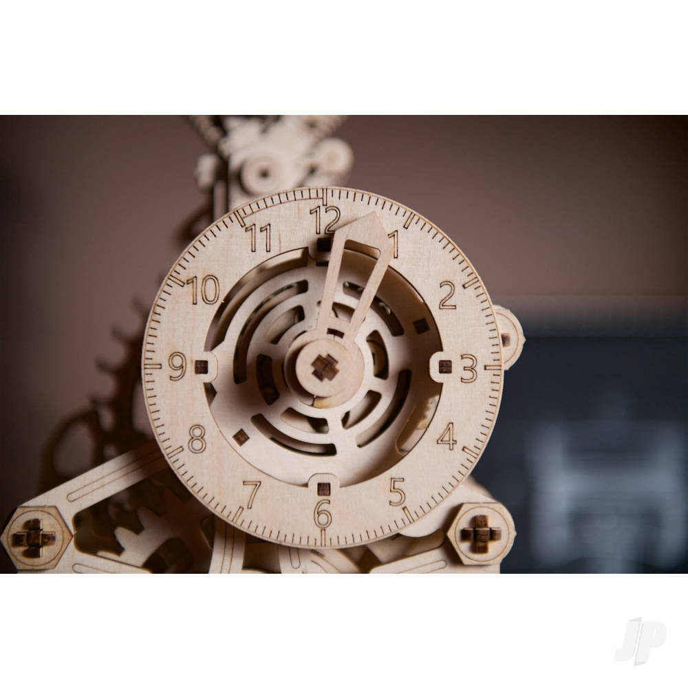 The DIY wooden Engine Clock is the latest addition to the UGears collection of working clocks, including the Aero Clock wall clock with pendulum, and the Sky Watcher Tourbillon Table Clock. While those models are both “Advanced” level, with the Engine Clock we strove to design a functional clock at the “Medium” difficulty level, so that more hobbyists could experience the satisfaction of building their own functional DIY 3D model clock. As with all UGears models, the Engine Clock is assembled without glue or special tools—just remove the laser pre-cut pieces from their art-quality composite wood boards and snap them together. Each kit comes with detailed, step-by-step, full-colour illustrated instructions in 11 languages (Ukrainian, English, German, French, Polish, Spanish, Portuguese, Turkish, Italian, Chinese and Korean) to guide your assembly, and sandpaper and wax to smooth and lubricate all moving parts for optimal function. If you get stuck during the assembly, need help troubleshooting, or break a piece during construction, just email our outstanding customer service team—we’ll be glad to answer any questions or send replacement parts free of charge.