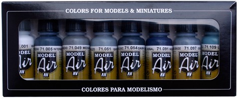 Collection of 8 color sets of Model Air for painting models and miniatures. Each one of these sets has a selection of special colors for painting vehicles, figures, etc. Contains 8 bottles of 17 ml. (with eyedropper) and color chart.