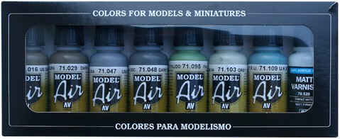 Collection of 8 color sets of Model Air for painting models and miniatures. Each one of these sets has a selection of special colors for painting vehicles, figures, etc. Contains 8 bottles of 17 ml. (with eyedropper) and color chart.