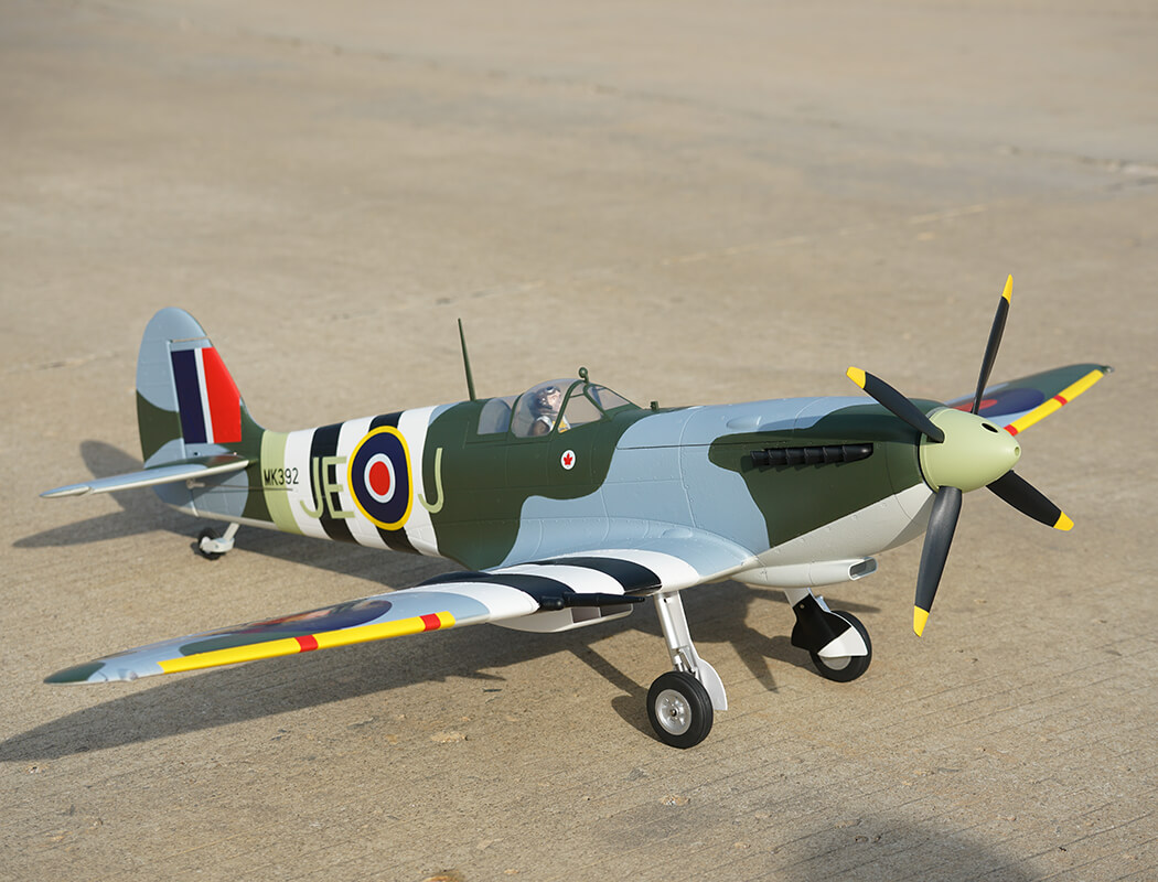 Choose between the desert brown edition that featured in combat in North Africa and the Mediterranean circa 1943 or the green D-Day Invasion of Europe from 1944, piloted by Canadian Ace Johnnie Johnson. Whatever you choose, this iconic stunner is ready to impress at your flying field!