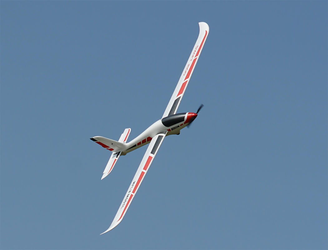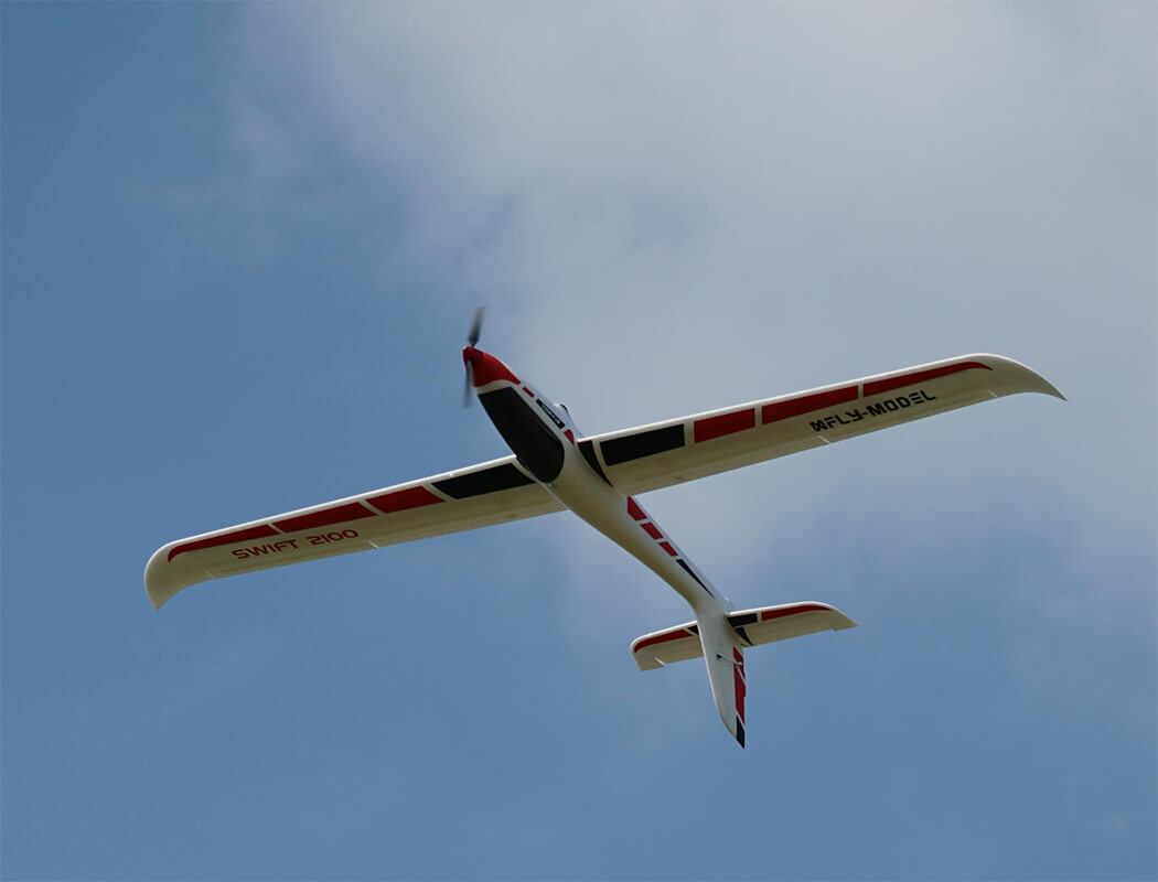The Swift 2100’s efficient aerodynamic design provides extended flight times up to 10-30mins with a mix of power on/off. The bottom wheel and plastic components on the wingtips and the tail allow the pilots to land on hard surface. Wing connectors and glueless design facilitate fast and easy assembly – only 6 screws needed to get the Swift 2100 ready to fly.