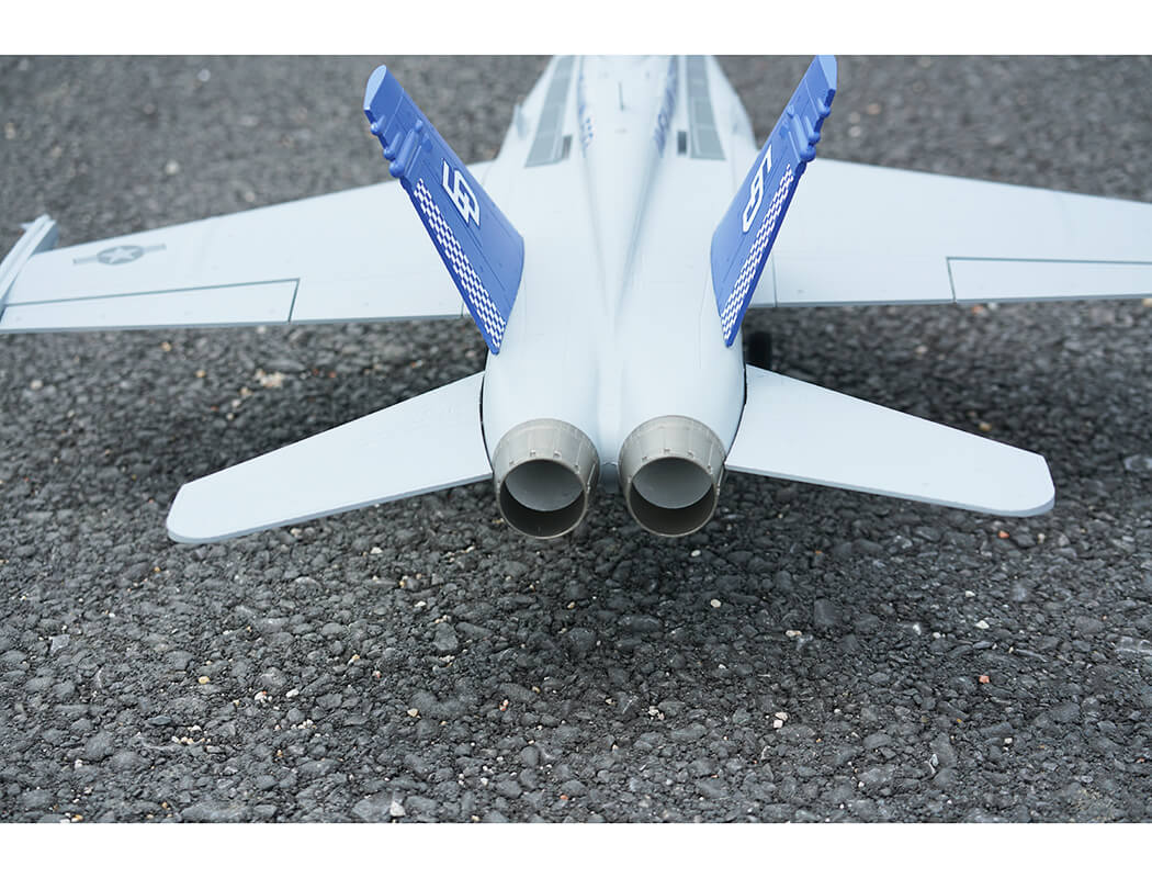 The factory-installed power system, including twin efficient 1413-KV5500 brushless motors and twin 20A brushless ESCs, paired with a 4S LiPo battery, delivers an abundance of thrust for fast climbs, rolls, loops and endless fun for high alpha flying due to the F-18’s low wing load and full flying stabs. A flight time of around 3-8 mins can be achieved with proper throttle management.