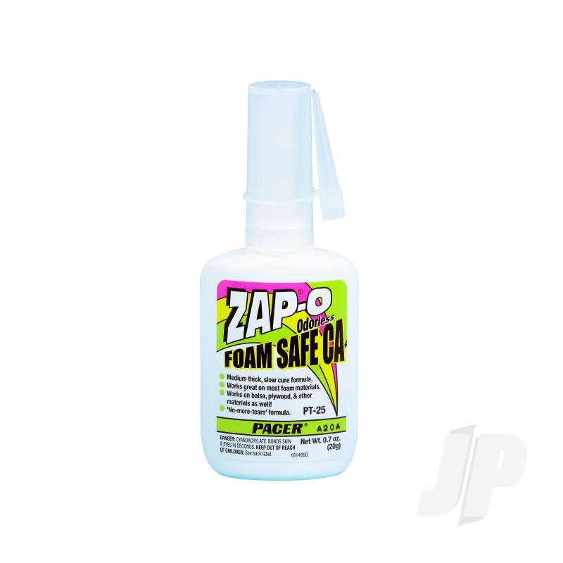 Zap-O Foam Safe CA is a true odorless CA. It has the same gap filling properties as Zap-A-Gap CA+ but without the fumes. It works great on balsa, plywood, bass wood and most other modeling and hobby materials. Zap-O Foam Safe CA is also great for craft work when gluing foam shapes or various materials to foam products. Medium thick formula that cures in 15 seconds. Packaged in a 20-gram bottle. To cure properly, Zap-O Foam Safe CA must be used with Zap Foam Safe Kicker (PT-28).